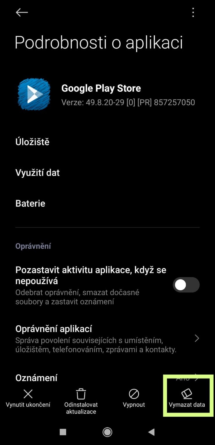 - V telefonu otevřete Nastavení → Aplikace → Google Play Store → Úložiště