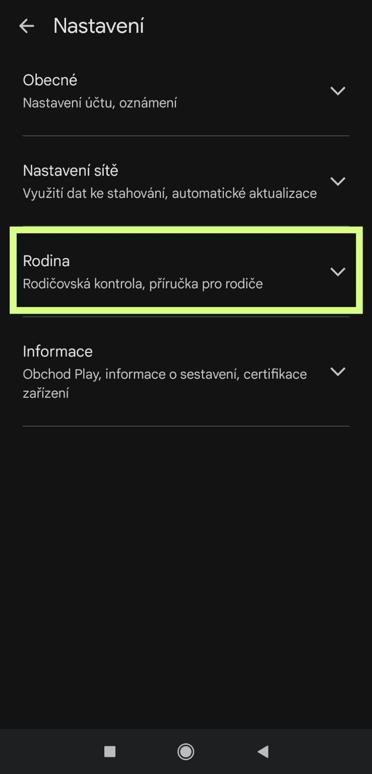 - Zvolte Nastavení → Rodina → Rodičovská kontrola
